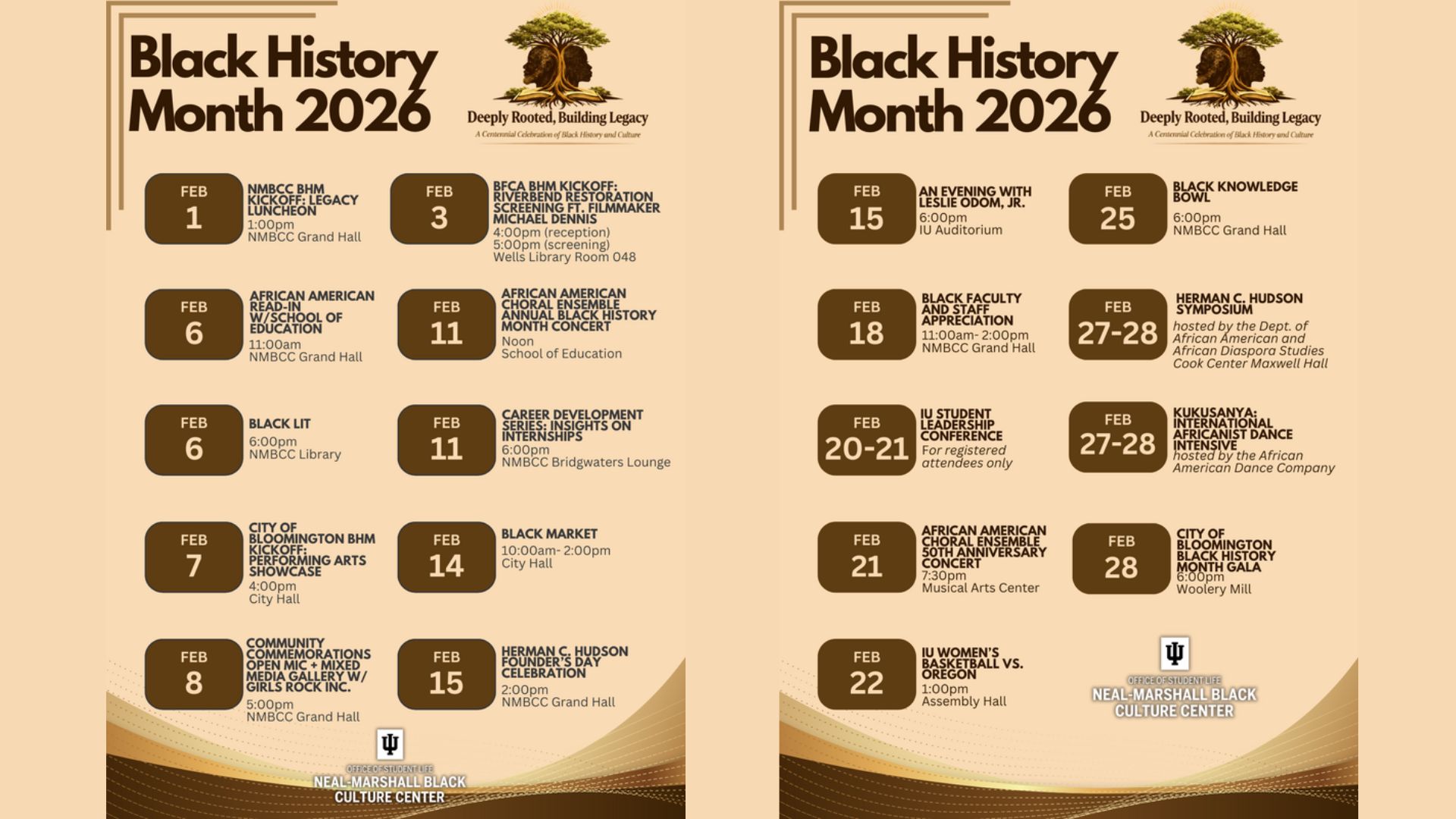 Black History Month programming will also extend into IU athletics with a women’s basketball matchup that blends school spirit and community pride. On Sunday, February 22, at 1:00 p.m., the IU women’s basketball team will face Oregon at Assembly Hall. Fans are encouraged to wear NMBCC or Black pride apparel and gather in section 10 near the band.