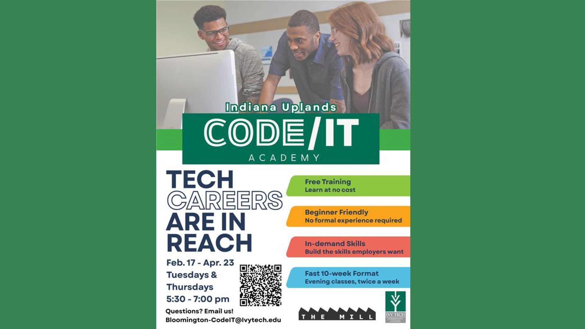 Applications for the spring cohort are open now, with a deadline of February 2, 2026. Those interested can find more information and apply online at ivytech.edu/codeit. Questions about the program can be directed to [email protected].