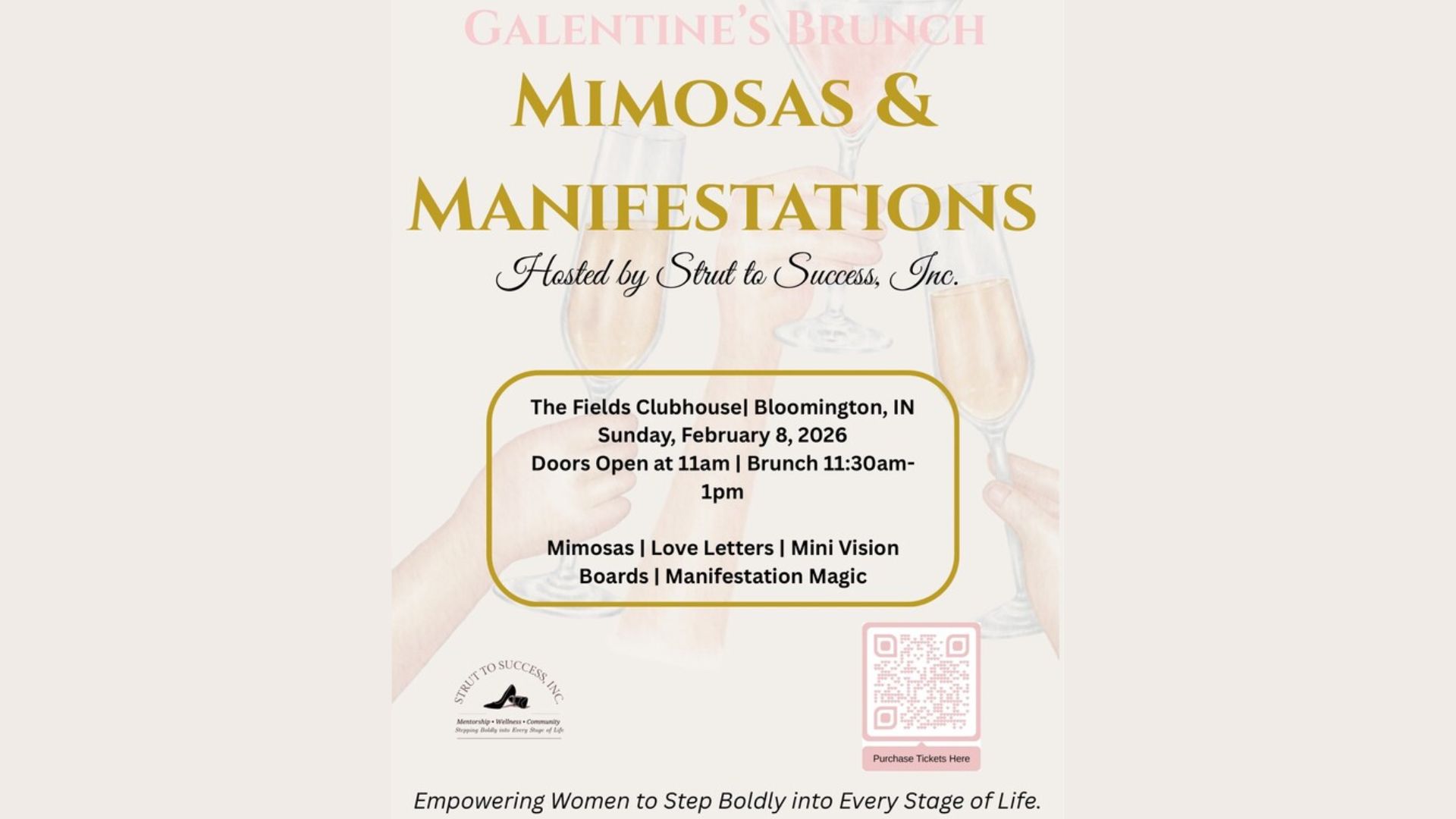 Bloomington, Indiana – Strut to Success, Inc. is inviting women to celebrate friendship, self-reflection, and empowerment at their upcoming Galentine’s Brunch: Mimosas & Manifestations on Sunday, February 8, 2026. The wellness-focused event will be held at The Fields Clubhouse in Bloomington, Indiana, offering attendees an opportunity to connect, celebrate, and focus on personal growth in a supportive and engaging environment.